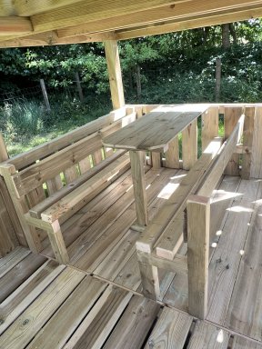 - Zitje beneden: 2 bankjes + tafel, grote houten vloer