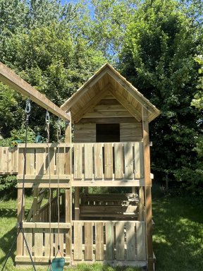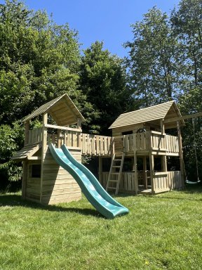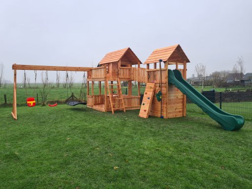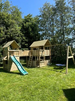 Dit mega speeltoestel is dé droomplek voor elk gezin dat écht uit wil pakken: twee robuuste torens, een groot balkon over de hele lengte, een gezellig speelhuisje bovenop én een knus zitje met bankjes en tafel onder het toestel. Alles verbonden met een 2 meter lange brug naar een tweede toren, die je naar wens kunt inrichten als speelhuisje met opbergruimte of als vrolijk verkoopwinkeltje met luifel. Met een extra lange schommelbalk (3 meter!) en nestschommel is dit toestel het middelpunt van elke tuin.