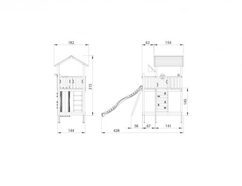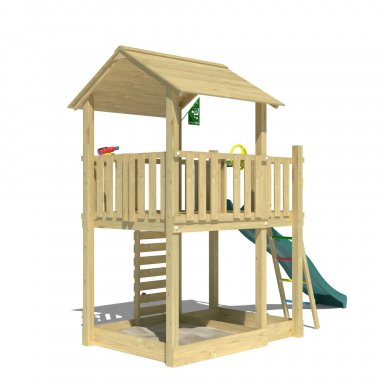 Kinderen kunnen naar het speeldek klimmen via de klimladder, schatten ontdekken in de zandbak, sturen met het stuurwiel, sterren kijken door de telescoop, en de muur beklimmen met grote handgrepen. Voor extra opwinding is de glijbaan voorzien van een wateraansluiting – ideaal voor een waterglijbaan op hete zomerdagen!