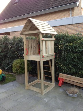Het is ook mogelijk om deze toren compleet gemonteerd en geplaatst te leveren, de kosten hiervoor zijn € 125,- voor de toren en € 25,- voor de eventuele aanbouwschommel. Hierbij komt nog een reiskosten vergoeding van € 0,30 per km (retour Drachten)
